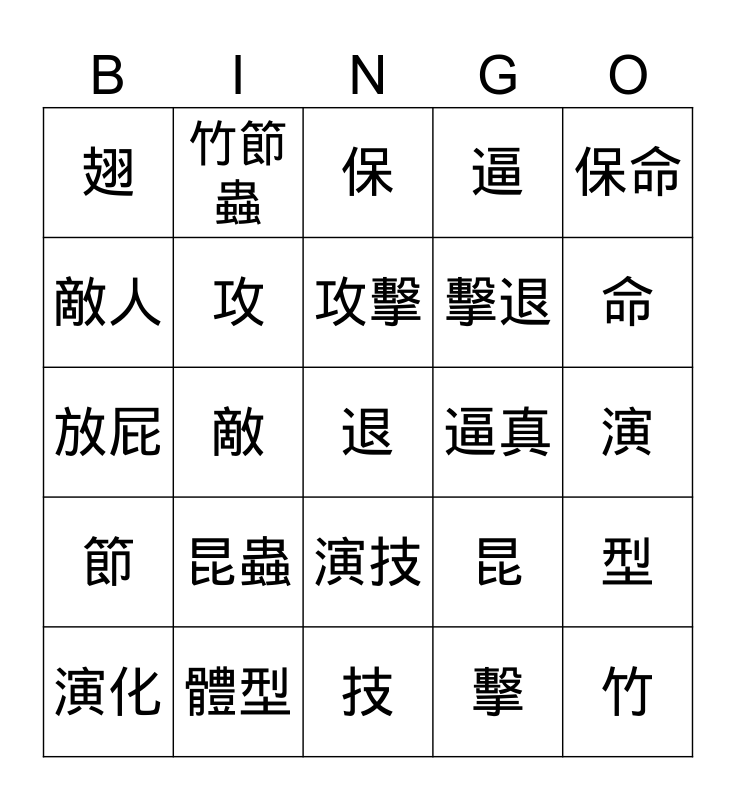 This bingo card has a free space and 24 words: 昆蟲, 體型, 攻擊, 演化, 保命, 翅, 敵人, 竹節蟲, 逼真, 演技, 擊退, 放屁, 昆, 型, 攻, 擊, 演, 保, 命, 敵, 竹, 節, 逼 and 技.