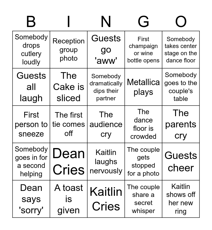 This bingo card has a free space and 24 words: Dean Cries, A toast is given, Somebody dramatically dips their partner, Dean says 'sorry', Somebody takes center stage on the dance floor, Somebody drops cutlery loudly, Guests all laugh, Reception group photo, The dance floor is crowded, Kaitlin laughs nervously, Metallica plays, First person to sneeze, The couple gets stopped for a photo, Guests cheer, The Cake is sliced, The couple share a secret whisper, The parents cry, Guests go 'aww', Somebody goes to the couple's table, The first tie comes off, Kaitlin shows off her new ring, Somebody goes in for a second helping, First champaign or wine bottle opens and Kaitlin Cries.