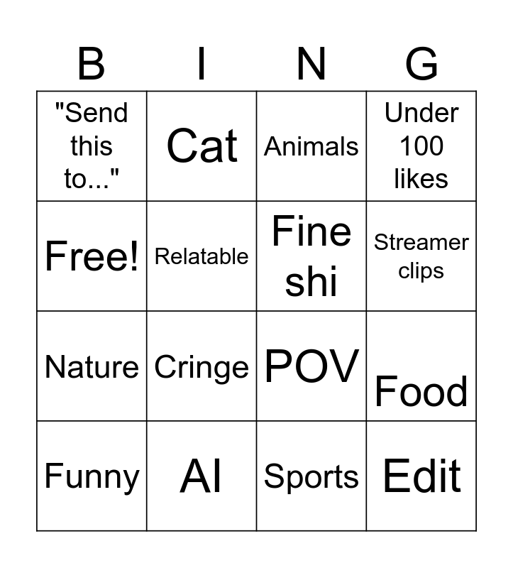 This bingo card has 16 words: AI, Food, Animals, "Send this to...", Nature, Cat, POV, Sports, Free!, Relatable, Funny, Under 100 likes, Cringe, Streamer clips, Fine shi and Edit.