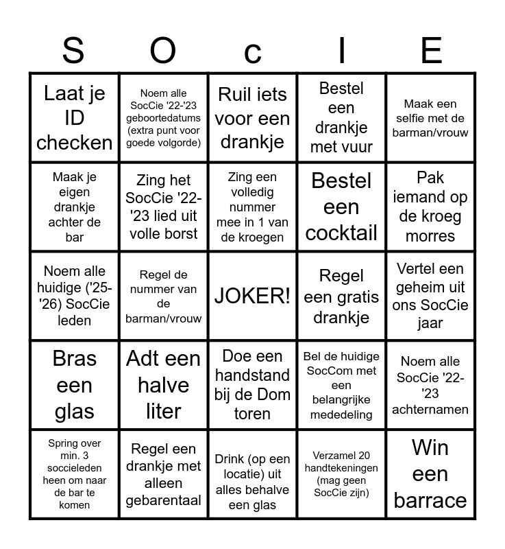 This bingo card has a free space and 24 words: Adt een halve liter, Regel een drankje met alleen gebarentaal, Zing een volledig nummer mee in 1 van de kroegen, Spring over min. 3 soccieleden heen om naar de bar te komen, Maak een selfie met de barman/vrouw, Laat je ID checken, Maak je eigen drankje achter de bar, Noem alle SocCie '22-'23 geboortedatums (extra punt voor goede volgorde), Regel een gratis drankje, Doe een handstand bij de Dom toren, Bestel een cocktail, Noem alle huidige ('25-'26) SocCie leden, Bel de huidige SocCom met een belangrijke mededeling, Noem alle SocCie '22-'23 achternamen, Zing het SocCie '22-'23 lied uit volle borst, Verzamel 20 handtekeningen (mag geen SocCie zijn), Vertel een geheim uit ons SocCie jaar, Ruil iets voor een drankje, Pak iemand op de kroeg morres, Regel de nummer van de barman/vrouw, Win een barrace, Bras een glas, Bestel een drankje met vuur and Drink (op een locatie) uit alles behalve een glas.