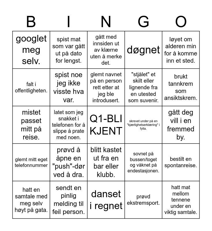 This bingo card has a free space and 24 words: prøvd å åpne en "push"-dør ved å dra., sendt en pinlig melding til feil person., glemt navnet på en person rett etter at jeg ble introdusert., hatt en samtale med meg selv høyt på gata., løyet om alderen min for å komme inn et sted., googlet meg selv., falt i offentligheten., spist mat som var gått ut på dato for lengst., skrevet under på en "kjærlighetserklæring" i fylla., blitt kastet ut fra en bar eller klubb., "stjålet" et skilt eller lignende fra en utested som suvenir., mistet passet mitt på reise., sovnet på bussen/toget og våknet på endestasjonen., bestilt en spontanreise., spist noe jeg ikke visste hva var., prøvd ekstremsport., gått deg vill i en fremmed by., gått med innsiden ut av klærne uten å merke det., brukt tannkrem som ansiktskrem., latet som jeg snakket i telefonen for å slippe å prate med noen., hatt mat mellom tennene under en viktig samtale., glemt mitt eget telefonnummer, døgnet and danset i regnet.