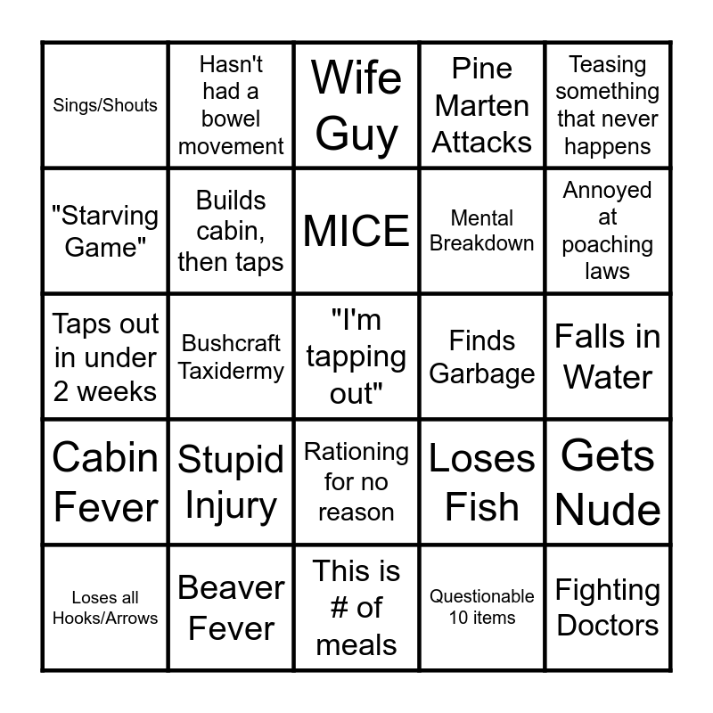 This bingo card has a free space and 27 words: Loses Fish, Climbs something unnecessary, Mental Breakdown, This is # of meals, "Starving Game", Wife Guy, Hasn't had a bowel movement, Cabin Fever, Finds Garbage, Gets Nude, Taps out in under 2 weeks, Pine Marten Attacks, Loses all Hooks/Arrows, Beaver Fever, Annoyed at poaching laws, Catches fish with fish in mouth, Builds cabin, then taps, MICE, Stupid Injury, Sings/Shouts, Falls in Water, Questionable 10 items, Bushcraft Taxidermy, Fighting Doctors, Rationing for no reason, Teasing something that never happens and Signs of Big Game (Never shows up).