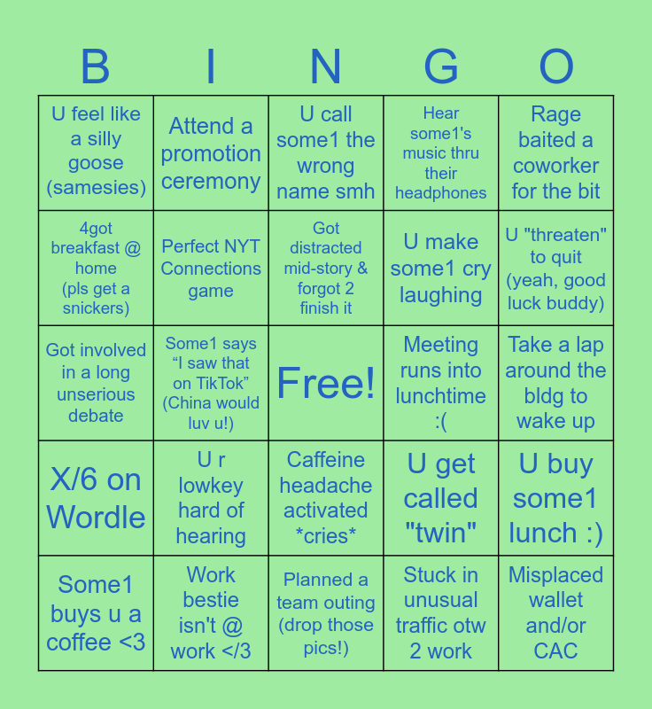 This bingo card has a free space and 24 words: Some1 buys u a coffee <3, U r lowkey hard of hearing, Got distracted mid-story & forgot 2 finish it, Stuck in unusual traffic otw 2 work, Rage baited a coworker for the bit, U feel like a silly goose (samesies), Attend a promotion ceremony, U call some1 the wrong name smh, Meeting runs into lunchtime :(, Take a lap around the bldg to wake up, Got involved in a long unserious debate, Perfect NYT Connections game, U get called "twin", U buy some1 lunch :), 4got breakfast @ home (pls get a snickers), Work bestie isn't @ work </3, Planned a team outing (drop those pics!), Hear some1's music thru their headphones, U "threaten" to quit (yeah, good luck buddy), X/6 on Wordle, Some1 says “I saw that on TikTok” (China would luv u!), Caffeine headache activated *cries*, U make some1 cry laughing and Misplaced wallet and/or CAC.