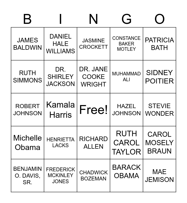 This bingo card has a free space and 24 words: HENRIETTA LACKS, FREDERICK MCKINLEY JONES, DR. JANE COOKE WRIGHT, BENJAMIN O. DAVIS, SR., PATRICIA BATH, JAMES BALDWIN, RUTH SIMMONS, DANIEL HALE WILLIAMS, HAZEL JOHNSON, RICHARD ALLEN, MUHAMMAD ALI, ROBERT JOHNSON, RUTH CAROL TAYLOR, CAROL MOSELY BRAUN, DR. SHIRLEY JACKSON, BARACK OBAMA, STEVIE WONDER, JASMINE CROCKETT, SIDNEY POITIER, Kamala Harris, MAE JEMISON, Michelle Obama, CONSTANCE BAKER MOTLEY and CHADWICK BOZEMAN.