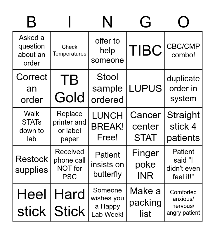 This bingo card has a free space and 29 words: Heel stick, centrifuge specimens, Replace printer and or label paper, collect 24hr urine, Asked a question about an order, offer to help someone, TB Gold, Received phone call NOT for PSC, Cancer center STAT, Hard Stick, Straight stick 4 patients, Comforted anxious/ nervous/ angry patient, Someone wishes you a Happy Lab Week!, Make a packing list, duplicate order in system, Wore lab week shirt, Patient insists on butterfly, Restock supplies, CBC/CMP combo!, Walk STATs down to lab, Finger poke INR, Answer the phone, LUPUS, Correct an order, TIBC, Check Temperatures, Patient said "I didn't even feel it!", Stool sample ordered and Patient has >6 tubes.