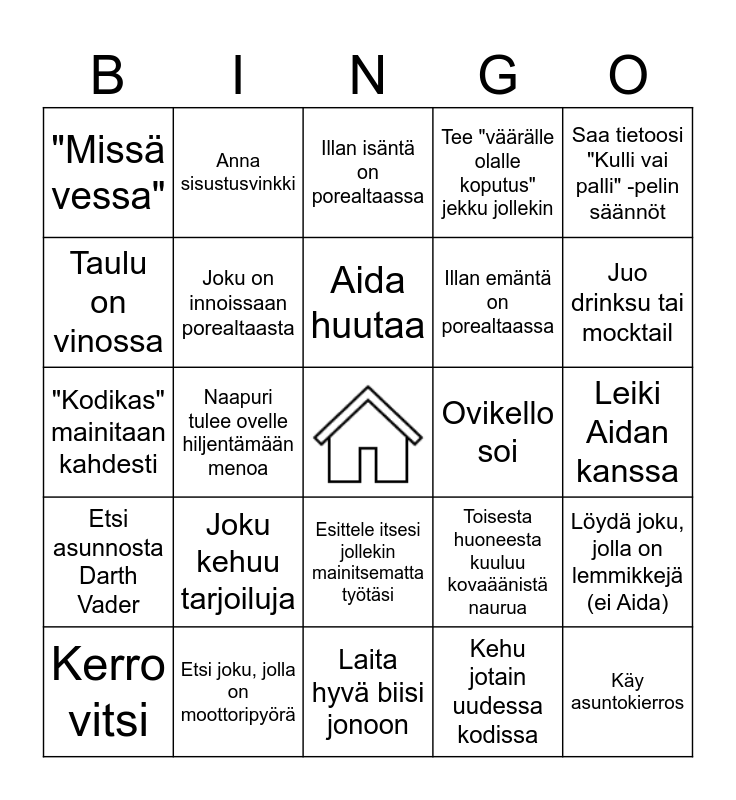 This bingo card has a free space and 24 words: Kerro vitsi, Joku kehuu tarjoiluja, Aida huutaa, Kehu jotain uudessa kodissa, Saa tietoosi "Kulli vai palli" -pelin säännöt, "Missä vessa", Anna sisustusvinkki, Illan isäntä on porealtaassa, Ovikello soi, Leiki Aidan kanssa, "Kodikas" mainitaan kahdesti, Joku on innoissaan porealtaasta, Toisesta huoneesta kuuluu kovaäänistä naurua, Löydä joku, jolla on lemmikkejä (ei Aida), Taulu on vinossa, Etsi joku, jolla on moottoripyörä, Laita hyvä biisi jonoon, Tee "väärälle olalle koputus" jekku jollekin, Juo drinksu tai mocktail, Etsi asunnosta Darth Vader, Naapuri tulee ovelle hiljentämään menoa, Esittele itsesi jollekin mainitsematta työtäsi, Illan emäntä on porealtaassa and Käy asuntokierros.