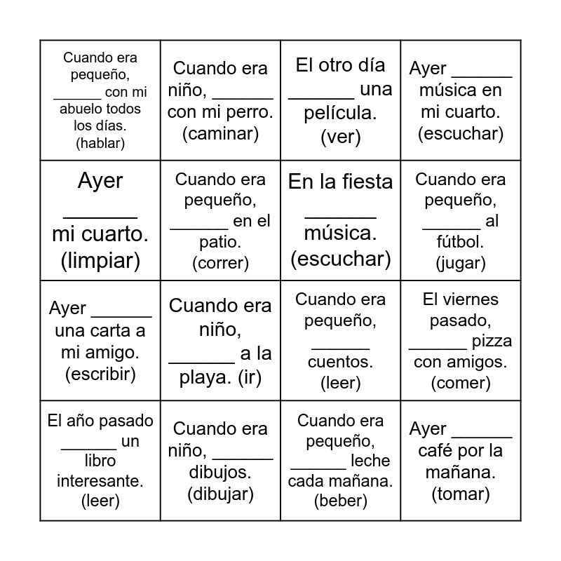 This bingo card has 30 words: Ayer ______ al parque. (ir), Cuando era niño, ______ mucho. (jugar), El viernes pasado, ______ pizza con amigos. (comer), Ayer ______ en casa todo el día. (estar), Cuando era pequeño, ______ con mi abuelo todos los días. (hablar), El otro día ______ una película. (ver), En la fiesta ______ música. (escuchar), Ayer ______ mi tarea después de clase. (hacer), Cuando era niño, ______ dibujos. (dibujar), Ayer ______ temprano de la escuela. (salir), Cuando era pequeño, ______ leche cada mañana. (beber), El año pasado ______ un libro interesante. (leer), De niño, ______ con mis amigos. (correr), Hoy ______ a mi mamá. (visitar), Cuando era niño, ______ a la playa. (ir), Por un momento en pd. 1, ______ mi mochila. (perder), Cuando era pequeño, ______ televisión mucho. (mirar), Ayer ______ café por la mañana. (tomar), Cuando era niño, ______ en un parque. (jugar), Ayer ______ mi cuarto. (limpiar), Cuando era pequeño, ______ cuentos. (leer), Ayer ______ mi bicicleta al parque. (llevar), Cuando era niño, ______ con mi perro. (caminar), Ayer ______ una carta a mi amigo. (escribir), Cuando era pequeño, ______ en el patio. (correr), Ayer ______ música en mi cuarto. (escuchar), Cuando era niño, ______ chocolate caliente. (beber), Ayer ______ al profesor una pregunta. (hacer), Cuando era pequeño, ______ al fútbol. (jugar) and Ayer ______ tarde a casa. (llegar).
