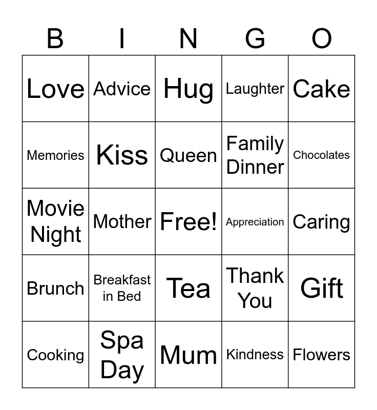 This bingo card has a free space and 31 words: Mum, Mummy, Mother, Family, Love, Hug, Kiss, Thank You, Appreciation, Kindness, Caring, Flowers, Bouquet, Roses, Chocolates, Card, Gift, Breakfast in Bed, Brunch, Tea, Cake, Baking, Cooking, Advice, Family Dinner, Memories, Laughter, Movie Night, Spa Day, Queen and Hero.