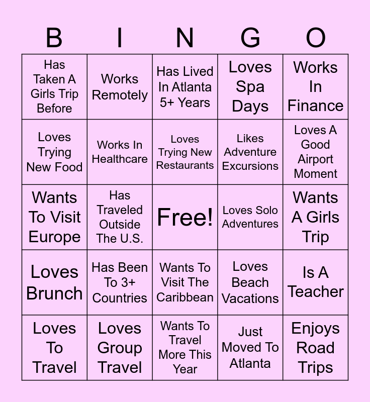 This bingo card has a free space and 32 words: Just Moved To Atlanta, Is Originally From Another State, Has Traveled Outside The U.S., Is Planning A Trip This Year, Loves Brunch, Works In Healthcare, Works In Finance, Is A Teacher, Works Remotely, Loves Nightlife, Loves Trying New Restaurants, Has Lived In Atlanta 5+ Years, Has A Passport Ready, Wants A Girls Trip Soon, Loves Solo Adventures, Has Been To Punch Bowl Before, Loves To Travel, Wants To Visit Europe, Wants To Visit The Caribbean, Has Been To 3+ Countries, Loves Beach Vacations, Prefers Mountains Over Beach, Wants A Girls Trip, Loves Group Travel, Enjoys Road Trips, Loves Spa Days, Likes Adventure Excursions, Loves Trying New Food, Has Taken A Girls Trip Before, Wants To Travel More This Year, Is Celebrating Something Soon and Loves A Good Airport Moment.