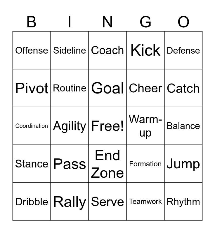 This bingo card has a free space and 24 words: Dribble, Pass, Goal, Teamwork, Defense, Offense, Sideline, Coach, Warm-up, Balance, Coordination, Routine, Formation, Jump, Pivot, Rally, Serve, Kick, Catch, Stance, Agility, End Zone, Cheer and Rhythm.