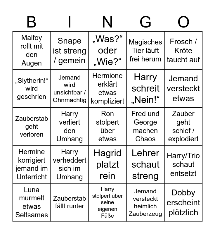 This bingo card has 25 words: Harry verheddert sich im Umhang, Harry stolpert über seine eigenen Füße, Hermione erklärt etwas kompliziert, Luna murmelt etwas Seltsames, Frosch / Kröte taucht auf, Malfoy rollt mit den Augen, „Slytherin!“ wird geschrien, Snape ist streng / gemein, Fred und George machen Chaos, Hagrid platzt rein, Harry schreit „Nein!“, Zauberstab geht verloren, Lehrer schaut streng, Harry/Trio schaut entsetzt, Jemand wird unsichtbar / Ohnmächtig, Dobby erscheint plötzlich, Zauber geht schief / explodiert, „Was?“ oder „Wie?“, Jemand versteckt etwas, Harry verliert den Umhang, Ron stolpert über etwas, Zauberstab fällt runter, Hermine korrigiert jemand im Unterricht, Magisches Tier läuft frei herum and Jemand versteckt heimlich Zauberzeug.