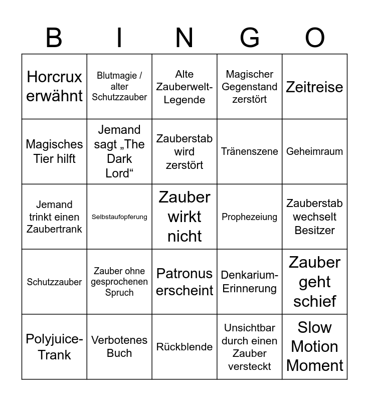 This bingo card has 25 words: Zauber ohne gesprochenen Spruch, Rückblende, Zauberstab wird zerstört, Polyjuice-Trank, Zeitreise, Horcrux erwähnt, Magisches Tier hilft, Blutmagie / alter Schutzzauber, Prophezeiung, Patronus erscheint, Tränenszene, Jemand trinkt einen Zaubertrank, Denkarium-Erinnerung, Zauber geht schief, Jemand sagt „The Dark Lord“, Slow Motion Moment, Zauberstab wechselt Besitzer, Alte Zauberwelt-Legende, Geheimraum, Selbstaufopferung, Zauber wirkt nicht, Verbotenes Buch, Schutzzauber, Magischer Gegenstand zerstört and Unsichtbar durch einen Zauber versteckt.