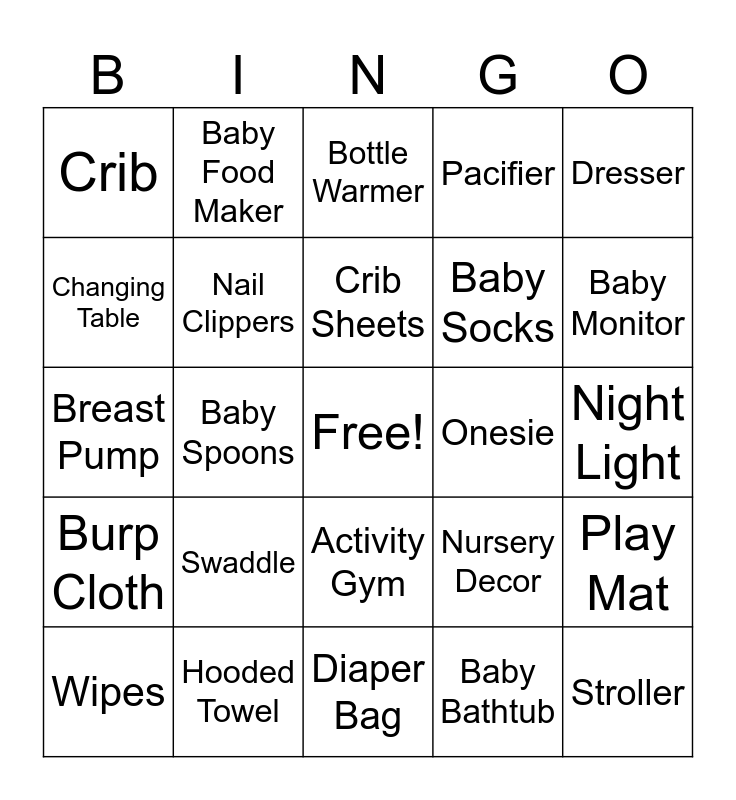 This bingo card has a free space and 48 words: High Chair, Stroller, Baby Shampoo, Diaper Bag, Swaddle, Baby Bottle, Baby Food Maker, Baby Blanket, Changing Table, Thermometer, Nail Clippers, Pacifier, Play Mat, Nursery Decor, Mittens, Mobile, Crib Sheets, Onesie, Washcloths, Dresser, Baby Spoons, Baby Bathtub, Crib, Baby Socks, Sound Machine, Baby Monitor, Wipes, Swing, Activity Gym, Burp Cloth, Diapers, Car Seat, Rocking Chair, Bouncer, Hooded Towel, Baby Lotion, Diaper Cream, Night Light, Sippy Cup, Nursing Pillow, Formula, Bassinet, Bottle Warmer, Bib, Breast Pump, Snack Container, Changing Pad and Bottle Brush.