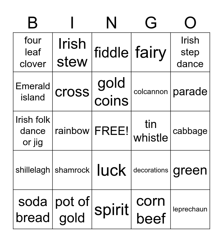 This bingo card has a free space and 24 words: shamrock, pot of gold, gold coins, soda bread, Irish step dance, four leaf clover, Emerald island, Irish stew, tin whistle, luck, colcannon, Irish folk dance or jig, decorations, green, cross, corn beef, cabbage, fiddle, parade, rainbow, leprechaun, shillelagh, fairy and spirit.