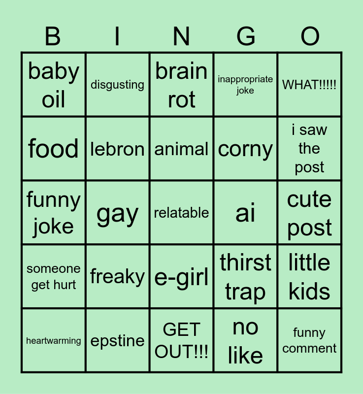 This bingo card has a free space and 24 words: freaky, epstine, animal, heartwarming, WHAT!!!!!, baby oil, food, disgusting, ai, e-girl, corny, funny joke, thirst trap, little kids, lebron, no like, cute post, brain rot, i saw the post, gay, funny comment, someone get hurt, inappropriate joke and GET OUT!!!.