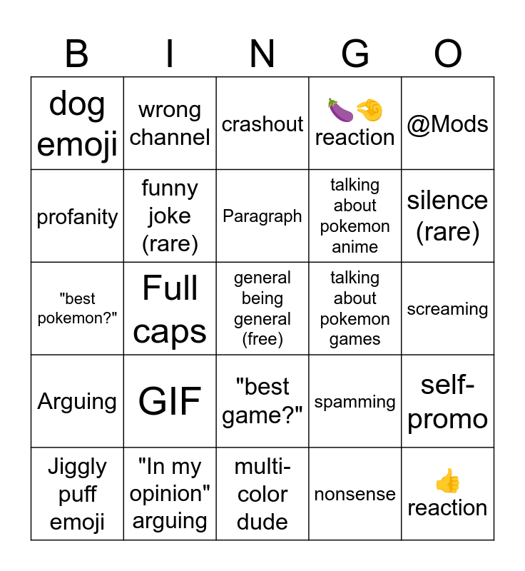 This bingo card has a free space and 24 words: GIF, "In my opinion" arguing, Paragraph, Jiggly puff emoji, @Mods, dog emoji, profanity, wrong channel, talking about pokemon games, "best game?", talking about pokemon anime, "best pokemon?", spamming, self-promo, funny joke (rare), nonsense, screaming, crashout, silence (rare), Full caps, 👍reaction, Arguing, 🍆🤏 reaction and multi-color dude.