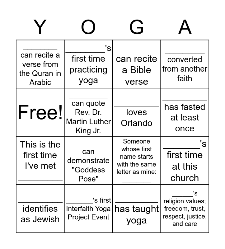 This bingo card has 16 words: _______'s first Interfaith Yoga Project Event, _______'s first time at this church, ______ can recite a Bible verse, ________ can recite a verse from the Quran in Arabic, This is the first time I've met _________, ________'s first time practicing yoga, Someone whose first name starts with the same letter as mine: ________, ________ has taught yoga, Free!, _________ can quote Rev. Dr. Martin Luther King Jr., _________ identifies as Jewish, _________ converted from another faith, _________ can demonstrate "Goddess Pose", _________ has fasted at least once, _________ loves Orlando and ______'s religion values; freedom, trust, respect, justice, and care.
