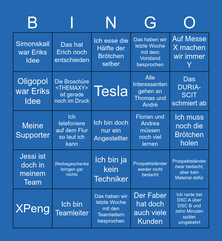 This bingo card has a free space and 24 words: Werbegeschenke bringen gar nichts, Ich bin Teamleiter, Tesla, XPeng, Auf Messe X machen wir immer Y, Simonskall war Eriks Idee, Oligopol war Eriks Idee, Das hat Erich noch entschieden, Florian und Andrea müssen noch viel lernen, Ich bin ja kein Techniker, Alle Interessenten gehen an Thomas und André, Meine Supporter, Prospektständer wieder nicht bedacht, Prospektständer zwar bedacht, aber kein Material dafür, Die Broschüre <THEMAXY> ist gerade noch im Druck, Der Faber hat doch auch viele Kunden, Ich muss noch die Brötchen holen, Ich esse die Hälfte der Brötchen selber, Das DURIA-SCIT schmiert ab, Ich telefoniere auf dem Flur so laut ich kann, Ich rante bei DSC A über DSC B und zehn Minuten später umgekehrt, Jessi ist doch in meinem Team, Das haben wir letzte Woche mit dem Vorstand besprochen and Das haben wir letzte Woche mit den Teamleitern besprochen.
