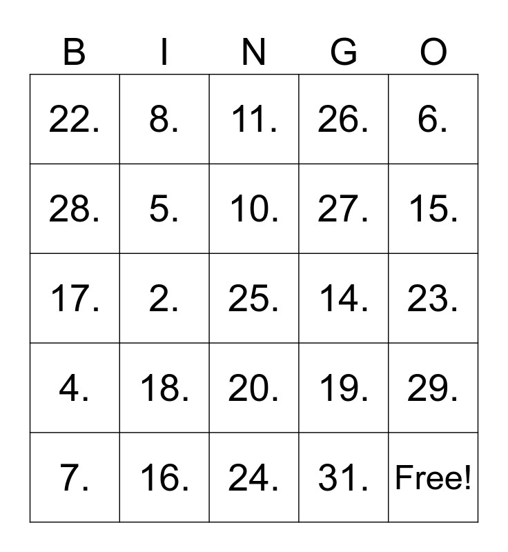 This bingo card has 33 words: Free!, 1., 2., 3., 4., 5., 6., 7., 8., 9., 10., 11., 12., 13., 14., 15., 16., 17., 18., 19., 20., 21., 22., 23., 24., 25., 26., 27., 28., 29., 30., 31. and 32..