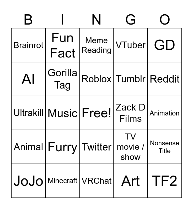 This bingo card has a free space and 24 words: Furry, Minecraft, Roblox, JoJo, GD, Brainrot, AI, Fun Fact, Zack D Films, Twitter, Tumblr, Ultrakill, TV movie / show, Nonsense Title, Gorilla Tag, Art, Animation, Meme Reading, Reddit, Music, TF2, Animal, VTuber and VRChat.