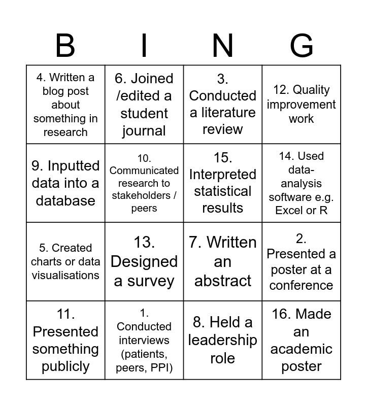 This bingo card has 16 words: 1. Conducted interviews (patients, peers, PPI), 2. Presented a poster at a conference, 3. Conducted a literature review, 4. Written a blog post about something in research, 5. Created charts or data visualisations, 6. Joined /edited a student journal, 7. Written an abstract, 8. Held a leadership role, 9. Inputted data into a database, 10. Communicated research to stakeholders / peers, 11. Presented something publicly, 12. Quality improvement work, 13. Designed a survey, 14. Used data-analysis software e.g. Excel or R, 15. Interpreted statistical results and 16. Made an academic poster.