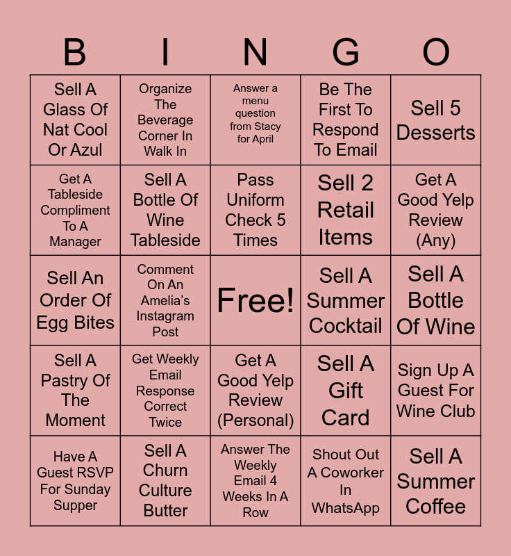 This bingo card has a free space and 24 words: Get Weekly Email Response Correct Twice, Sell A Churn Culture Butter, Pass Uniform Check 5 Times, Have A Guest RSVP For Sunday Supper, Sell 5 Desserts, Sell A Glass Of Nat Cool Or Azul, Get A Tableside Compliment To A Manager, Organize The Beverage Corner In Walk In, Sell A Summer Cocktail, Get A Good Yelp Review (Personal), Sell 2 Retail Items, Sell An Order Of Egg Bites, Sell A Gift Card, Sign Up A Guest For Wine Club, Sell A Bottle Of Wine Tableside, Shout Out A Coworker In WhatsApp, Sell A Bottle Of Wine, Answer a menu question from Stacy for April, Get A Good Yelp Review (Any), Comment On An Amelia’s Instagram Post, Sell A Summer Coffee, Sell A Pastry Of The Moment, Be The First To Respond To Email and Answer The Weekly Email 4 Weeks In A Row.