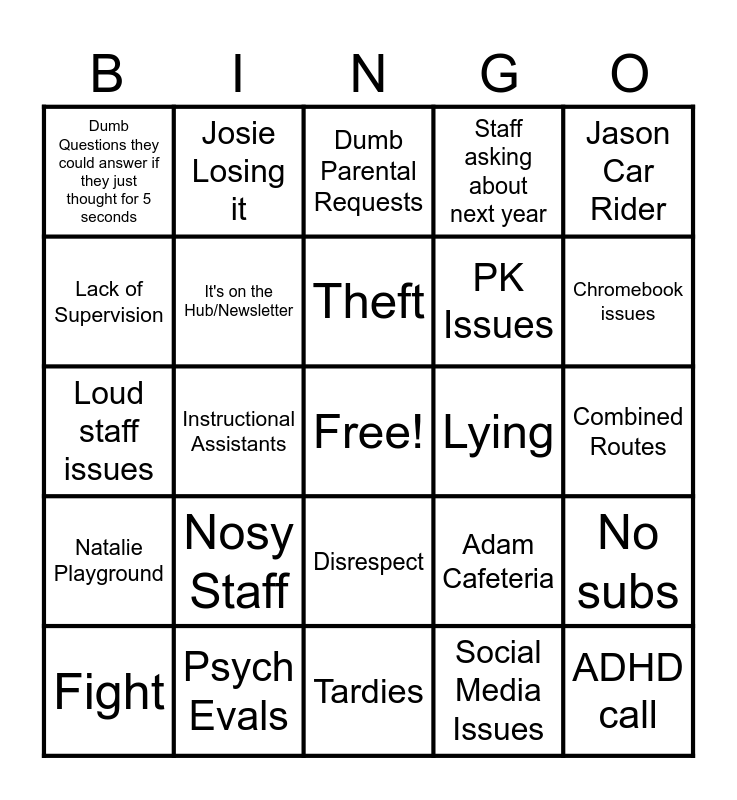This bingo card has a free space and 24 words: Fight, Nosy Staff, Theft, Social Media Issues, Jason Car Rider, Dumb Questions they could answer if they just thought for 5 seconds, Josie Losing it, Dumb Parental Requests, Lying, Combined Routes, Loud staff issues, It's on the Hub/Newsletter, Adam Cafeteria, No subs, Lack of Supervision, Psych Evals, Tardies, Staff asking about next year, Chromebook issues, Natalie Playground, Instructional Assistants, Disrespect, PK Issues and ADHD call.
