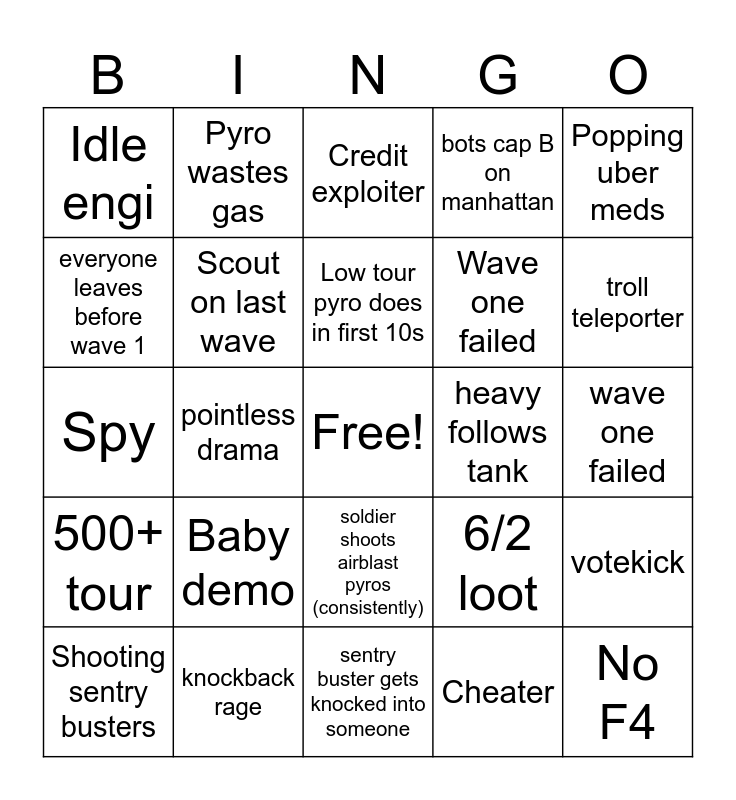 This bingo card has a free space and 24 words: Shooting sentry busters, Baby demo, Low tour pyro does in first 10s, Cheater, Popping uber meds, Idle engi, Pyro wastes gas, Credit exploiter, heavy follows tank, wave one failed, Spy, Scout on last wave, 6/2 loot, votekick, everyone leaves before wave 1, knockback rage, sentry buster gets knocked into someone, bots cap B on manhattan, troll teleporter, 500+ tour, pointless drama, soldier shoots airblast pyros (consistently), Wave one failed and No F4.