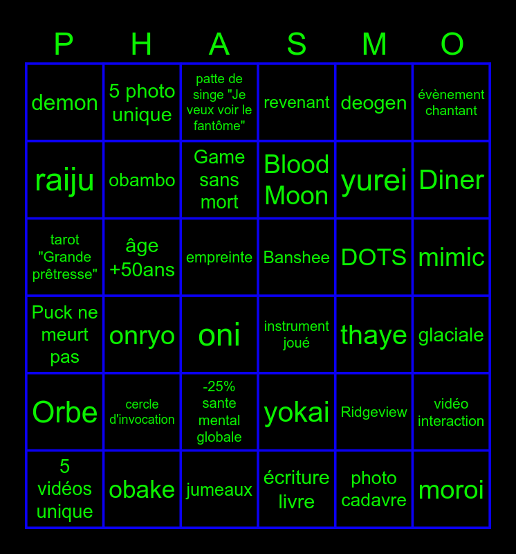 This bingo card has 97 words: Tanglewood, Edgefield, Ridgeview, Diner, Grafton, Willow, Camping, Phare, Bleasdale, Asile, Prison, Ecole, Grand Camping, Banshee, Dayan, demon, deogen, gallu, goryo, hantu, djinn, cauchemar, moroi, myling, obake, obambo, oni, onryo, fantome, poltergeist, raiju, revenant, ombre, esprit, thaye, mimic, jumeaux, spectre, yokai, yurei, EMF 5, empreinte, écriture livre, glaciale, DOTS, Orbe, Spirit, miroir, patte de singe, boite a musique, planche Ouija, cercle d'invocation, Tarot, poupée vaudou, photo fantôme, photo empreinte 6 doigts, photo cadavre, 5 photo unique, vidéo fantôme, vidéo interaction, 5 vidéos unique, Son fantôme, Son en chasse, 3 son unique, objet qui lévite, disjoncteur, eau sale, ballon qui bouge, écran allume, instrument joué, Game sans mort, Game parfaite, Game -10min, skin a poil, skin enfant, skin Sadako, skin vieille, âge -50ans, âge +50ans, 0% sante mentale, -25% sante mental globale, Blood Moon, chasse sans se cacher, cage thoracique, crane, colonne vertébrale, tarot "Grande prêtresse", tarot "Le pendue", Ouija "Cache-Cache", Loop du fantôme, patte de singe "Je veux voir le fantôme", Ruby ne meurt pas, Youyou se cache pas, Puck ne meurt pas, évènement chantant, lumière rouge and lumière pétée.