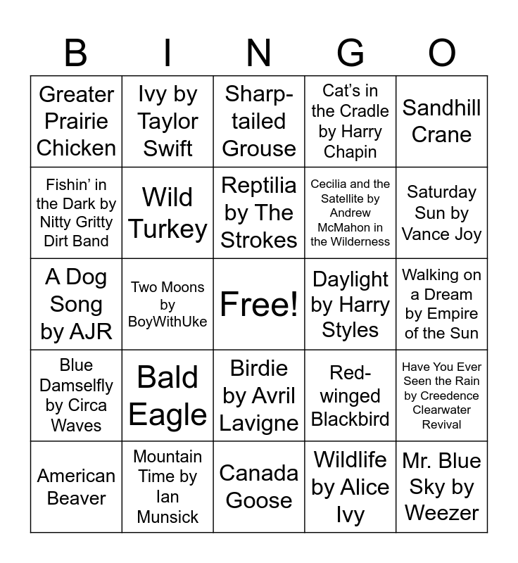 This bingo card has a free space and 63 words: Painted Sky by The National Parks, Fly Like an Eagle by Steve Miller Band, Hungry Like the Wolf by Duran Duran, Have You Ever Seen the Rain by Creedence Clearwater Revival, Bull Frog, Waterfalls by TLC, Ivy by Taylor Swift, Birding by Swet Shop Boyrs, Reptilia by The Strokes, Welcome to the Jungle by Guns N’ Roses, Birdie by Avril Lavigne, Sorry I’m Late, I Didn’t Want to Come by The Wombats, Walking on a Dream by Empire of the Sun, Sandhill Crane, Your Direction by Goose, Fishin’ in the Dark by Nitty Gritty Dirt Band, Two Moons by BoyWithUke, Greater Prairie Chicken, Wildfire by John Mayer, Cecilia and the Satellite by Andrew McMahon in the Wilderness, Bald Eagle, Blue Damselfly by Circa Waves, Cat’s in the Cradle by Harry Chapin, American Kestrel, Elephant by Tame Impala, Day N’ Nite by Kid Cudi, Dancing in the Moonlight by King Harvest, Whiskey and Rain by Michael Ray, Thunderstruck by AC/DC, The Fate of Ophelia by Taylor Swift, Heat Waves by Glass Animals, Fluorescent Adolescent by Arctic Monkeys, Roses by The Chainsmokers, Trouble by Cage the Elephant, Saturday Sun by Vance Joy, American Beaver, Take Me Home, Country Roads by John Denver, Wildlife by Alice Ivy, American Robin, Wild Turkey, A Dog Song by AJR, Daylight by Harry Styles, Numb Little Bug by Em Beihold, Animal by Neon Trees, Mr. Blue Sky by Weezer, Mountain Time by Ian Munsick, Bobcat, Red-winged Blackbird, I’m Like a Bird by Nelly Furtado, Wildflowers by Trampled by Turtles, Mallard, Canada Goose, Shake the Frost by Tyler Childers, The Fox by Ylvis, One Headlight by The Wallflowers, Sharp-tailed Grouse, sun to me by MGK, Space Ghost Coast to Coast by Glass Animals, The Little Birds by Bob Marley & The Wailers, Accidentally in Love by Counting Crows, The Pink Panther by Henry Mancini, Rock You Like a Hurricane by Scorpions and Flowers by Miley Cyrus.