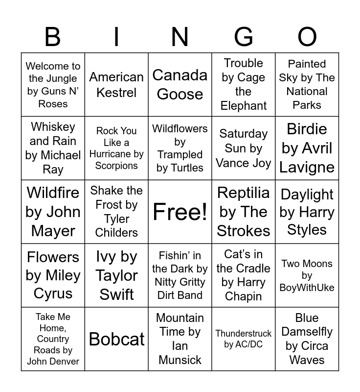 This bingo card has a free space and 63 words: A Dog Song by AJR, Bald Eagle, Walking on a Dream by Empire of the Sun, Two Moons by BoyWithUke, The Fox by Ylvis, American Robin, American Kestrel, Cecilia and the Satellite by Andrew McMahon in the Wilderness, Wildflowers by Trampled by Turtles, Birding by Swet Shop Boyrs, Fishin’ in the Dark by Nitty Gritty Dirt Band, The Pink Panther by Henry Mancini, Daylight by Harry Styles, Painted Sky by The National Parks, The Fate of Ophelia by Taylor Swift, Whiskey and Rain by Michael Ray, Shake the Frost by Tyler Childers, Welcome to the Jungle by Guns N’ Roses, Have You Ever Seen the Rain by Creedence Clearwater Revival, Saturday Sun by Vance Joy, Ivy by Taylor Swift, Flowers by Miley Cyrus, Trouble by Cage the Elephant, Space Ghost Coast to Coast by Glass Animals, Heat Waves by Glass Animals, Fluorescent Adolescent by Arctic Monkeys, Accidentally in Love by Counting Crows, Animal by Neon Trees, Day N’ Nite by Kid Cudi, Bull Frog, Sharp-tailed Grouse, Your Direction by Goose, Red-winged Blackbird, Numb Little Bug by Em Beihold, Birdie by Avril Lavigne, Take Me Home, Country Roads by John Denver, American Beaver, Thunderstruck by AC/DC, Hungry Like the Wolf by Duran Duran, Rock You Like a Hurricane by Scorpions, Wildfire by John Mayer, Reptilia by The Strokes, I’m Like a Bird by Nelly Furtado, Wild Turkey, Blue Damselfly by Circa Waves, Bobcat, Greater Prairie Chicken, Cat’s in the Cradle by Harry Chapin, Mr. Blue Sky by Weezer, Waterfalls by TLC, Sorry I’m Late, I Didn’t Want to Come by The Wombats, Mountain Time by Ian Munsick, The Little Birds by Bob Marley & The Wailers, Elephant by Tame Impala, Fly Like an Eagle by Steve Miller Band, Canada Goose, sun to me by MGK, Dancing in the Moonlight by King Harvest, Sandhill Crane, One Headlight by The Wallflowers, Roses by The Chainsmokers, Mallard and Wildlife by Alice Ivy.