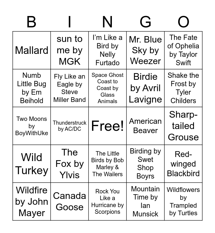 This bingo card has a free space and 63 words: A Dog Song by AJR, Roses by The Chainsmokers, American Kestrel, Red-winged Blackbird, Flowers by Miley Cyrus, Fishin’ in the Dark by Nitty Gritty Dirt Band, sun to me by MGK, Saturday Sun by Vance Joy, Space Ghost Coast to Coast by Glass Animals, Bobcat, The Little Birds by Bob Marley & The Wailers, Daylight by Harry Styles, Sharp-tailed Grouse, The Fate of Ophelia by Taylor Swift, Hungry Like the Wolf by Duran Duran, Numb Little Bug by Em Beihold, Thunderstruck by AC/DC, Mallard, Elephant by Tame Impala, Birdie by Avril Lavigne, The Fox by Ylvis, Wild Turkey, Mr. Blue Sky by Weezer, The Pink Panther by Henry Mancini, Animal by Neon Trees, Walking on a Dream by Empire of the Sun, Painted Sky by The National Parks, Whiskey and Rain by Michael Ray, Trouble by Cage the Elephant, Dancing in the Moonlight by King Harvest, Welcome to the Jungle by Guns N’ Roses, Your Direction by Goose, Reptilia by The Strokes, Day N’ Nite by Kid Cudi, Shake the Frost by Tyler Childers, Wildfire by John Mayer, Greater Prairie Chicken, Mountain Time by Ian Munsick, Wildlife by Alice Ivy, Fly Like an Eagle by Steve Miller Band, Two Moons by BoyWithUke, American Beaver, Fluorescent Adolescent by Arctic Monkeys, Cecilia and the Satellite by Andrew McMahon in the Wilderness, Wildflowers by Trampled by Turtles, Canada Goose, Ivy by Taylor Swift, Birding by Swet Shop Boyrs, Blue Damselfly by Circa Waves, Sorry I’m Late, I Didn’t Want to Come by The Wombats, Cat’s in the Cradle by Harry Chapin, Rock You Like a Hurricane by Scorpions, American Robin, Have You Ever Seen the Rain by Creedence Clearwater Revival, Heat Waves by Glass Animals, I’m Like a Bird by Nelly Furtado, Take Me Home, Country Roads by John Denver, Bald Eagle, Bull Frog, Waterfalls by TLC, Sandhill Crane, One Headlight by The Wallflowers and Accidentally in Love by Counting Crows.