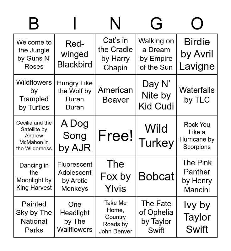 This bingo card has a free space and 63 words: American Robin, sun to me by MGK, Blue Damselfly by Circa Waves, The Pink Panther by Henry Mancini, The Little Birds by Bob Marley & The Wailers, Mountain Time by Ian Munsick, Red-winged Blackbird, Greater Prairie Chicken, American Beaver, Wildfire by John Mayer, The Fox by Ylvis, Mr. Blue Sky by Weezer, Rock You Like a Hurricane by Scorpions, Birdie by Avril Lavigne, Have You Ever Seen the Rain by Creedence Clearwater Revival, Wildflowers by Trampled by Turtles, A Dog Song by AJR, Welcome to the Jungle by Guns N’ Roses, Fishin’ in the Dark by Nitty Gritty Dirt Band, Day N’ Nite by Kid Cudi, Fluorescent Adolescent by Arctic Monkeys, Dancing in the Moonlight by King Harvest, Walking on a Dream by Empire of the Sun, Thunderstruck by AC/DC, Space Ghost Coast to Coast by Glass Animals, Animal by Neon Trees, Reptilia by The Strokes, I’m Like a Bird by Nelly Furtado, Numb Little Bug by Em Beihold, American Kestrel, Bull Frog, Sandhill Crane, Sharp-tailed Grouse, Roses by The Chainsmokers, Waterfalls by TLC, Painted Sky by The National Parks, Heat Waves by Glass Animals, The Fate of Ophelia by Taylor Swift, Your Direction by Goose, Hungry Like the Wolf by Duran Duran, Cecilia and the Satellite by Andrew McMahon in the Wilderness, Wild Turkey, Shake the Frost by Tyler Childers, Elephant by Tame Impala, Ivy by Taylor Swift, One Headlight by The Wallflowers, Sorry I’m Late, I Didn’t Want to Come by The Wombats, Bobcat, Wildlife by Alice Ivy, Mallard, Daylight by Harry Styles, Take Me Home, Country Roads by John Denver, Trouble by Cage the Elephant, Saturday Sun by Vance Joy, Birding by Swet Shop Boyrs, Cat’s in the Cradle by Harry Chapin, Flowers by Miley Cyrus, Two Moons by BoyWithUke, Canada Goose, Bald Eagle, Fly Like an Eagle by Steve Miller Band, Whiskey and Rain by Michael Ray and Accidentally in Love by Counting Crows.