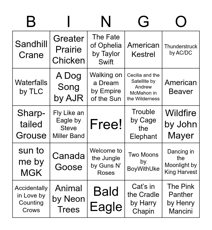 This bingo card has a free space and 63 words: Heat Waves by Glass Animals, Fluorescent Adolescent by Arctic Monkeys, Wild Turkey, Dancing in the Moonlight by King Harvest, Fishin’ in the Dark by Nitty Gritty Dirt Band, American Robin, Greater Prairie Chicken, Reptilia by The Strokes, Walking on a Dream by Empire of the Sun, Birding by Swet Shop Boyrs, Welcome to the Jungle by Guns N’ Roses, Bull Frog, Wildfire by John Mayer, Thunderstruck by AC/DC, Saturday Sun by Vance Joy, Waterfalls by TLC, Fly Like an Eagle by Steve Miller Band, Sandhill Crane, Numb Little Bug by Em Beihold, Cecilia and the Satellite by Andrew McMahon in the Wilderness, Canada Goose, sun to me by MGK, American Kestrel, Whiskey and Rain by Michael Ray, Mountain Time by Ian Munsick, Space Ghost Coast to Coast by Glass Animals, Hungry Like the Wolf by Duran Duran, Shake the Frost by Tyler Childers, Blue Damselfly by Circa Waves, Roses by The Chainsmokers, One Headlight by The Wallflowers, Birdie by Avril Lavigne, The Little Birds by Bob Marley & The Wailers, Day N’ Nite by Kid Cudi, American Beaver, Accidentally in Love by Counting Crows, Ivy by Taylor Swift, Cat’s in the Cradle by Harry Chapin, Wildlife by Alice Ivy, A Dog Song by AJR, Sharp-tailed Grouse, Trouble by Cage the Elephant, I’m Like a Bird by Nelly Furtado, Have You Ever Seen the Rain by Creedence Clearwater Revival, The Pink Panther by Henry Mancini, Animal by Neon Trees, Flowers by Miley Cyrus, Two Moons by BoyWithUke, The Fox by Ylvis, Bobcat, Wildflowers by Trampled by Turtles, Bald Eagle, Elephant by Tame Impala, Mr. Blue Sky by Weezer, Your Direction by Goose, The Fate of Ophelia by Taylor Swift, Mallard, Painted Sky by The National Parks, Sorry I’m Late, I Didn’t Want to Come by The Wombats, Daylight by Harry Styles, Take Me Home, Country Roads by John Denver, Red-winged Blackbird and Rock You Like a Hurricane by Scorpions.