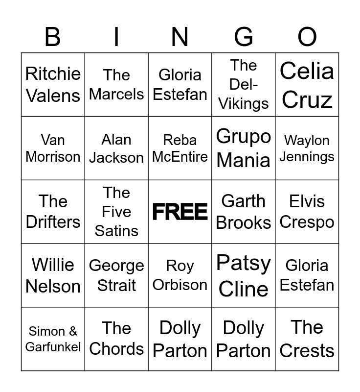 This bingo card has a free space and 48 words: Ronnie Milsap, The Crests, Paul Simon, Dolly Parton, George Strait, Santana, The Marcels, Sha Na Na, Van Morrison, Frankie Valli, Alan Jackson, The Del-Vikings, Gloria Estefan, Patsy Cline, Crystal Gayle, The Penguins, Reba McEntire, Garth Brooks, Paul Simon, Celia Cruz, The Five Satins, Dolly Parton, Ritchie Valens, Grupo Mania, The Diamonds, Waylon Jennings, Simon & Garfunkel, Brooks & Dunn, Roy Orbison, Willie Nelson, The Platters, Santana, Johnny Cash, Tito Puente, The Chords, The Drifters, Maurice Williams & The Zodiacs, Elvis Crespo, John Denver, Merle Haggard, Kenny Rogers, The Angels, Gloria Estefan, Elvis Crespo, The Drifters, The Drifters, Frankie Valli & The Four Seasons and Frankie Lymon & The Teenagers.