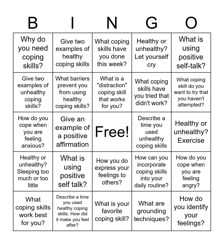 This bingo card has a free space and 27 words: How can you incorporate coping skills into your daily routine?, Do you avoid probelms when they arise? Do you think this is a healthy coping skill?, What coping skills have you tried that didn't work?, What is your favorite coping skill?, Give two examples of unhealthy coping skills?, What coping skills have you done this week?, Give two examples of healthy coping skills, Healthy or unhealthy? Sleeping too much or too little, Describe a time you used unhealthy coping skills, How do you cope when you are feeling angry?, How do you cope when you are feeling anxious?, Healthy or unhealthy? Let yourself cry, What coping skills work best for you?, Describe a time you used healthy coping skills. How did it make you feel after?, What coping skill do you want to try that you haven't attempted?, How do you cope when you are feeling depressed?, What barriers prevent you from using healthy coping skills?, What is a "distraction" coping skill that works for you?, What is using positive self talk?, Why do you need coping skills?, Healthy or unhealthy? Exercise, What are grounding techniques?, Give an example of a positive affirmation, How do you identify your feelings?, How you do express your feelings to others?, What is using positive self-talk? and What is your favorite coping skill?.