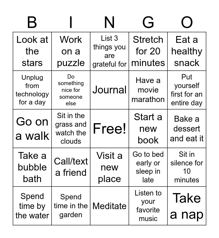 This bingo card has a free space and 24 words: Call/text a friend, Spend time in the garden, Journal, Spend time by the water, Eat a healthy snack, Look at the stars, Unplug from technology for a day, Work on a puzzle, Start a new book, Visit a new place, Have a movie marathon, Go on a walk, Go to bed early or sleep in late, Sit in silence for 10 minutes, Do something nice for someone else, Listen to your favorite music, Bake a dessert and eat it, List 3 things you are grateful for, Put yourself first for an entire day, Sit in the grass and watch the clouds, Take a nap, Take a bubble bath, Stretch for 20 minutes and Meditate.