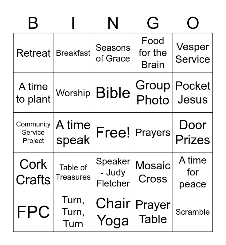 This bingo card has a free space and 34 words: Singing, Prayer Table, Communion, Free Time, Cork Crafts, Worship, Vesper Service, FPC, Breakfast, Breakout Sessions, Bible, Seasons of Grace, A time to love, Love Offering, Prayers, Pocket Jesus, Turn, Turn, Turn, Community Service Project, Table of Treasures, Mosaic Cross, Speaker - Judy Fletcher, Prothro, Retreat, Door Prizes, Chair Yoga, Scramble, Food for the Brain, Lake View, Group Photo, A time to plant, A time to laugh, A time speak, A time for peace and Gift from God.