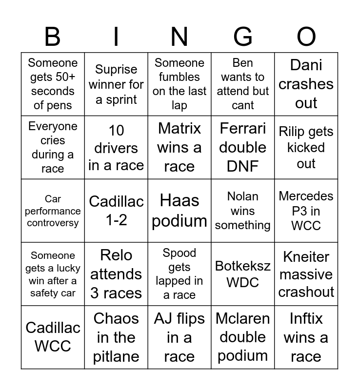 This bingo card has a free space and 24 words: Relo attends 3 races, Chaos in the pitlane, Matrix wins a race, Cadillac WCC, Dani crashes out, Someone gets 50+ seconds of pens, Everyone cries during a race, Suprise winner for a sprint, Nolan wins something, Spood gets lapped in a race, Ferrari double DNF, Car performance controversy, Botkeksz WDC, Kneiter massive crashout, 10 drivers in a race, Mclaren double podium, Mercedes P3 in WCC, Someone fumbles on the last lap, Rilip gets kicked out, Cadillac 1-2, Inftix wins a race, Someone gets a lucky win after a safety car, Ben wants to attend but cant and AJ flips in a race.
