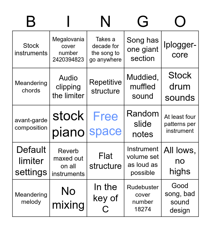 This bingo card has a free space and 24 words: Reverb maxed out on all instruments, No mixing, Repetitive structure, Meandering melody, Iplogger-core, Stock instruments, Meandering chords, Megalovania cover number 2420394823, Random slide notes, Flat structure, Muddied, muffled sound, avant-garde composition, Instrument volume set as loud as possible, All lows, no highs, Audio clipping the limiter, Rudebuster cover number 18274, At least four patterns per instrument, Takes a decade for the song to go anywhere, Stock drum sounds, stock piano, Good song, bad sound design, Default limiter settings, Song has one giant section and In the key of C.