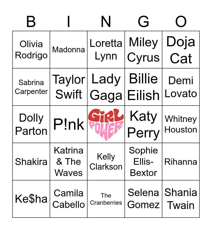 This bingo card has a free space and 47 words: The Pussycat Dolls, Shania Twain, Fleetwood Mac, The Cranberries, Katrina & The Waves, Sia, Madonna, Cyndi Lauper, Sabrina Carpenter, Dua Lipa, Taylor Swift, Miley Cyrus, Rihanna, Sophie Ellis-Bextor, Natasha Bedingfield, Jennifer Lopez, Lady Gaga, Katy Perry, Britney Spears, Doja Cat, P!nk, Selena Gomez, Olivia Rodrigo, Billie Eilish, Ava Max, Demi Lovato, Ke$ha, Beyoncé, Kelly Clarkson, Shakira, Lana Del Rey, Kylie Minogue, Alicia Keys, Christina Aguilera, Meghan Trainor, Camila Cabello, Whitney Houston, Donna Summer, Gwen Stefani, Jessie J, Ellie Goulding, Loretta Lynn, Dolly Parton, Alanis Morissette, Elle King, Gretchen Wilson and Bananarama.