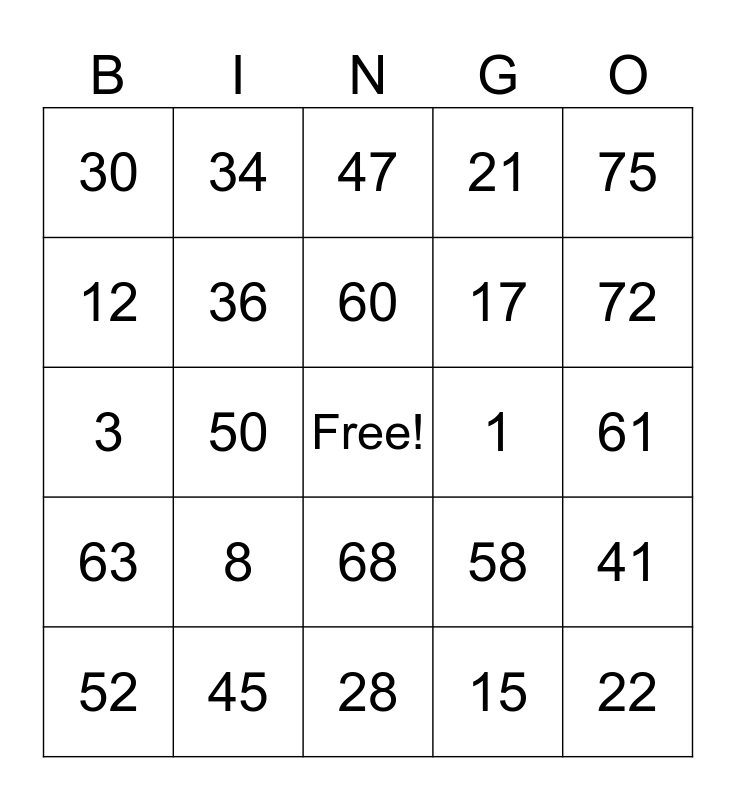 This bingo card has a free space and 24 words: 8, 45, 60, 52, 75, 30, 12, 34, 1, 68, 17, 3, 58, 41, 36, 15, 61, 47, 72, 50, 22, 63, 21 and 28.