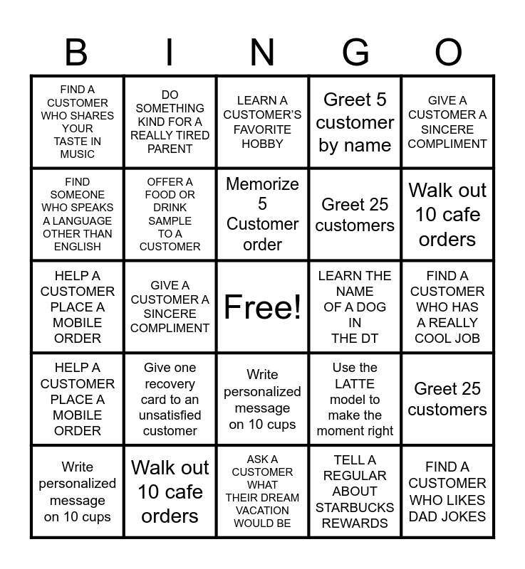 This bingo card has a free space and 24 words: Give one recovery card to an unsatisfied customer, Walk out 10 cafe orders, Memorize 5 Customer order, Write personalized message on 10 cups, GIVE A CUSTOMER A SINCERE COMPLIMENT, FIND A CUSTOMER WHO SHARES YOUR TASTE IN MUSIC, FIND SOMEONE WHO SPEAKS A LANGUAGE OTHER THAN ENGLISH, DO SOMETHING KIND FOR A REALLY TIRED PARENT, LEARN THE NAME OF A DOG IN THE DT, Write personalized message on 10 cups, Greet 25 customers, HELP A CUSTOMER PLACE A MOBILE ORDER, Use the LATTE model to make the moment right, Greet 25 customers, OFFER A FOOD OR DRINK SAMPLE TO A CUSTOMER, TELL A REGULAR ABOUT STARBUCKS REWARDS, FIND A CUSTOMER WHO HAS A REALLY COOL JOB, LEARN A CUSTOMER’S FAVORITE HOBBY, Walk out 10 cafe orders, GIVE A CUSTOMER A SINCERE COMPLIMENT, FIND A CUSTOMER WHO LIKES DAD JOKES, HELP A CUSTOMER PLACE A MOBILE ORDER, Greet 5 customer by name and ASK A CUSTOMER WHAT THEIR DREAM VACATION WOULD BE.