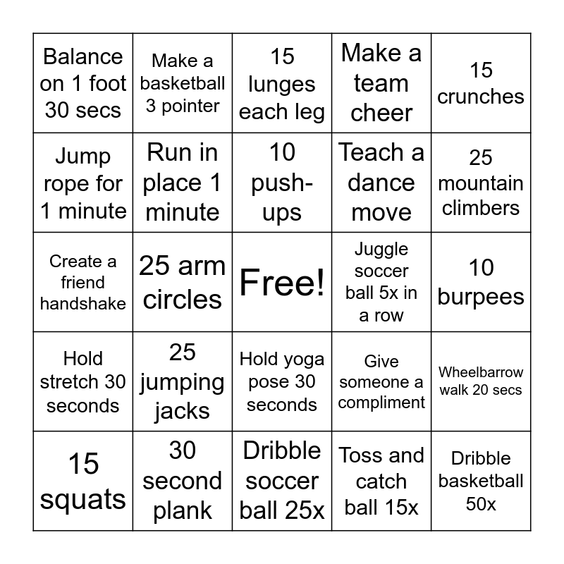 This bingo card has a free space and 24 words: 25 jumping jacks, 30 second plank, 10 push-ups, 15 squats, 15 crunches, Balance on 1 foot 30 secs, Jump rope for 1 minute, Make a basketball 3 pointer, Juggle soccer ball 5x in a row, Hold yoga pose 30 seconds, Teach a dance move, Create a friend handshake, Give someone a compliment, Wheelbarrow walk 20 secs, Run in place 1 minute, Toss and catch ball 15x, 10 burpees, 15 lunges each leg, 25 mountain climbers, 25 arm circles, Dribble basketball 50x, Hold stretch 30 seconds, Make a team cheer and Dribble soccer ball 25x.
