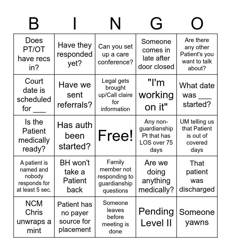 This bingo card has a free space and 24 words: BH won't take a Patient back, Patient has no payer source for placement, Legal gets brought up/Call claire for information, NCM Chris unwraps a mint, Are there any other Patient's you want to talk about?, Does PT/OT have recs in?, Court date is scheduled for ___, Have they responded yet?, Any non-guardianship Pt that has LOS over 75 days, Family member not responding to guardianship questions, "I'm working on it", Is the Patient medically ready?, Are we doing anything medically?, That patient was discharged, Have we sent referrals?, Pending Level II, UM telling us that Patient is out of covered days, Can you set up a care conference?, What date was ___ started?, Has auth been started?, Someone yawns, A patient is named and nobody responds for at least 5 sec., Someone comes in late after door closed and Someone leaves before meeting is done.