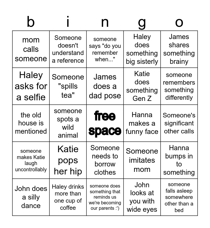 This bingo card has a free space and 24 words: Katie pops her hip, Haley drinks more than one cup of coffee, James does a dad pose, John does a silly dance, James shares something brainy, mom calls someone, Haley asks for a selfie, Someone doesn't understand a reference, Hanna makes a funny face, Someone needs to borrow clothes, Katie does something Gen Z, the old house is mentioned, Someone imitates mom, Hanna bumps in to something, Someone "spills tea", John looks at you with wide eyes, Someone's significant other calls, someone says "do you remember when...", someone remembers something differently, someone spots a wild animal, someone falls asleep somewhere other than a bed, someone makes Katie laugh uncontrollably, Haley does something big sisterly and someone does something that reminds us we're becoming our parents :').