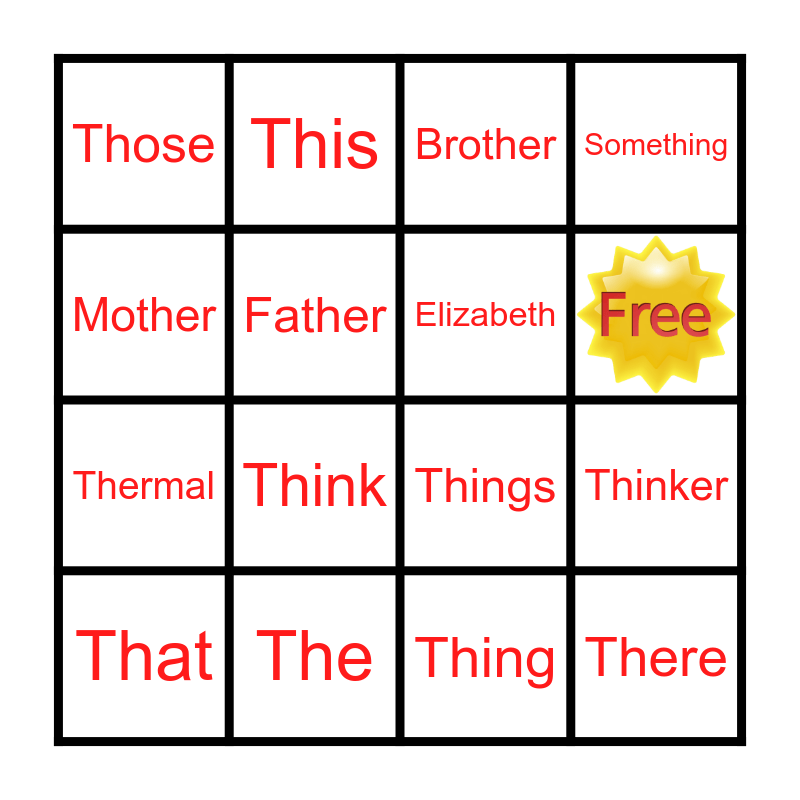 This bingo card has 1 images and 15 words: The, Thinker, Brother, Those, Thermal, This, Things, Thing, Mother, Father, That, Something, Think, Elizabeth and There.