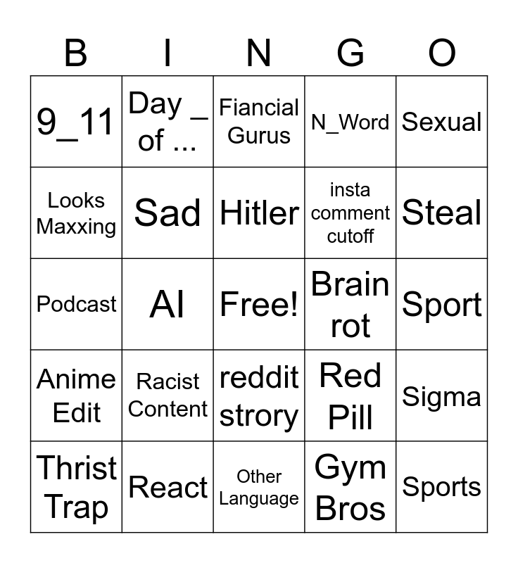 This bingo card has a free space and 24 words: Racist Content, React, Hitler, Thrist Trap, Sexual, 9_11, Looks Maxxing, Day _ of ..., Brain rot, reddit strory, insta comment cutoff, Podcast, Red Pill, Sigma, Sad, Gym Bros, Sport, Fiancial Gurus, Steal, AI, Sports, Anime Edit, N_Word and Other Language.