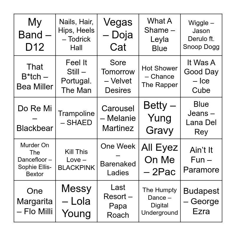This bingo card has 62 words: Lady Marmalade – Christina Aguilera ft. All of ‘em, Messy – Lola Young, Safe and Sound – Capital Cities, Murder On The Dancefloor – Sophie Ellis-Bextor, Budapest – George Ezra, Play That Funky Music – Wild Cherry, Feel It Still – Portugal. The Man, Shut Up – Jessie Reyez, Hot Shower – Chance The Rapper, Stick Season – Noah Kahan, What A Shame – Leyla Blue, I’m An Albatraoz – AronChupa & Little Sis Nora, That B*tch – Bea Miller, Stand Up – Ludacris, Crazy Rap (Colt 45 & 2 Zig Zags) – Afroman, My Band – D12, Carousel – Melanie Martinez, Wiggle – Jason Derulo ft. Snoop Dogg, Golden – HUNTR/X, Sore Tomorrow – Velvet Desires, Betty – Yung Gravy, Vegas – Doja Cat, One Margarita – Flo Milli, The Humpty Dance – Digital Underground, I Love It – Icona Pop ft. Charli XCX, Rasputin – Boney M, Enemy – Imagine Dragons x JID, WHERE IS MY HUSBAND – RAYE, Ain’t It Fun – Paramore, Summer – Calvin Harris, Daisy – Ashnikko, Magnets – Disclosure ft. Lorde, The Devil Wears Lace – Steven Rodriguez, Why’d You Only Call Me When You’re High? – Arctic Monkeys, Blue Jeans – Lana Del Rey, Nails, Hair, Hips, Heels – Todrick Hall, BILLIE EILISH – Armani White, Cinderella Snapped – Jax, Trampoline – SHAED, Boom Clap – Charli XCX, Do Re Mi – Blackbear, Toss A Coin To Your Witcher – Witcher, Kill This Love – BLACKPINK, Squabble Up – Kendrick Lamar, It Was A Good Day – Ice Cube, All Eyez On Me – 2Pac, Cleanin’ Out My Closet – Eminem, Walk This Way – RUN-D.M.C., I Was Made For Lovin’ You – KISS, We Will Rock You – Queen, One Week – Barenaked Ladies, Last Resort – Papa Roach, Sharp Dressed Man – ZZ Top, I’m a Believer – Smash Mouth, Footloose – Kenny Loggins, Cherry Pie – Warrant, Superstition – Stevie Wonder, In Case You Didn’t Know – Brett Young, Heaven – Kane Brown, Need You Now – Lady Antebellum, This Is How We Roll – FGL ft. Luke Bryan and Girl Crush – Little Big Town.