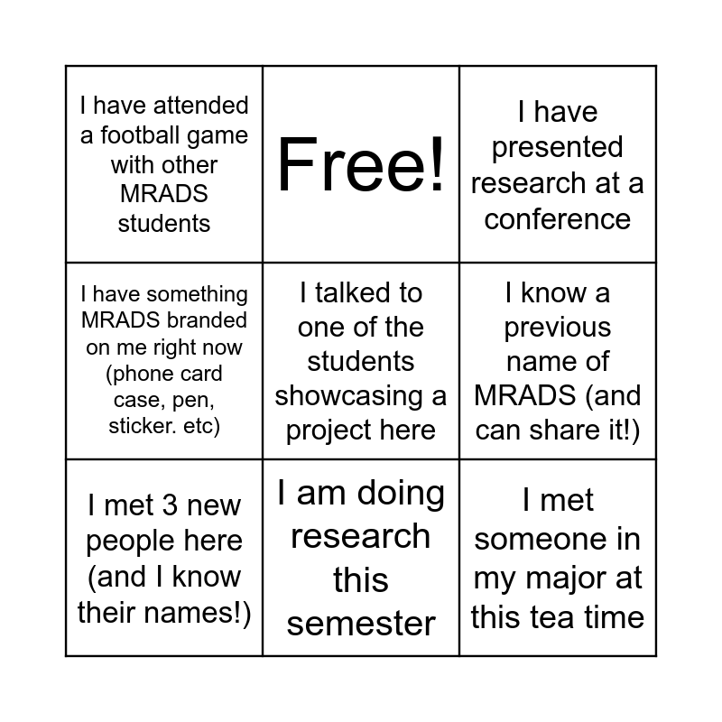 This bingo card has 12 words: I am wearing an MRADS shirt/sweater, I met someone in my major at this tea time, I talked to one of the students showcasing a project here, I know a previous name of MRADS (and can share it!), Free!, I have presented research at a conference, I am doing research this semester, I have attended another tea time this semester or last semester, I have attended a football game with other MRADS students, I have something MRADS branded on me right now (phone card case, pen, sticker. etc), I met 3 new people here (and I know their names!) and I am planning to attend this year's symposium on 4/23.